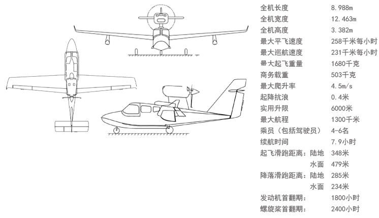 海鷗300飛機(jī)是由中航工業(yè)石家莊飛機(jī)工業(yè)有限責(zé)任公司和中航工業(yè)特種飛行器研究所聯(lián)合研制的輕型水陸兩棲飛機(jī)。該機(jī)按單駕駛體制、雙操縱設(shè)計(jì),采用懸臂式中上機(jī)翼、“十”字型尾翼、高置單發(fā)、前三點(diǎn)可收放式起落架、船身式布局形式,擁有我國(guó)完全自主知識(shí)產(chǎn)權(quán),填補(bǔ)了我國(guó)輕型水陸兩棲飛機(jī)研制生產(chǎn)的空白,設(shè)計(jì)和制造符合中國(guó)民航CCAR-23-R3要求。